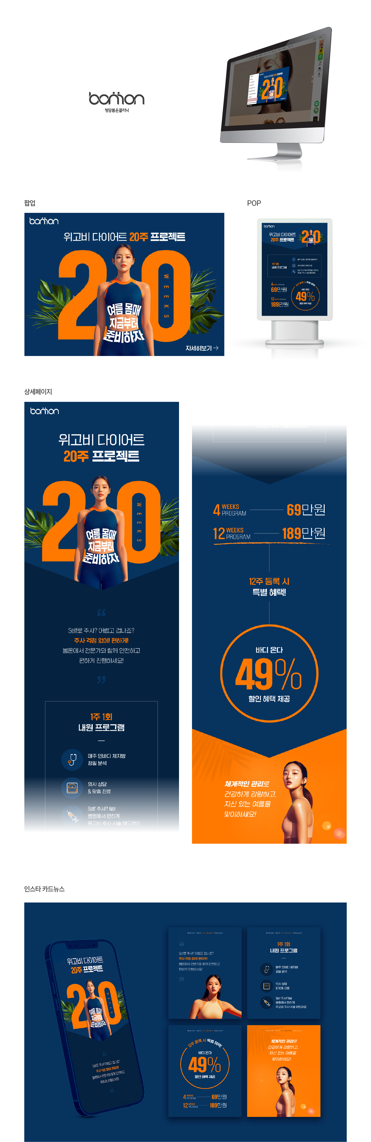 메인 컬러로 다크블루와 오렌지 계열을 사용해 계절감과 강렬함을 동시에 담아내며, 신뢰감 있는 분위기 속에서도 시선을 사로잡는 구성을 목표로 제작하였습니다. ✔ 상세페이지, POP, 카드뉴스 통합 패키지 디자인 ✔ 시즌 캠페인 메시지 중심의 타이포 비주얼 강조 ✔ 20주 프로그램의 신뢰감과 전문성 부각