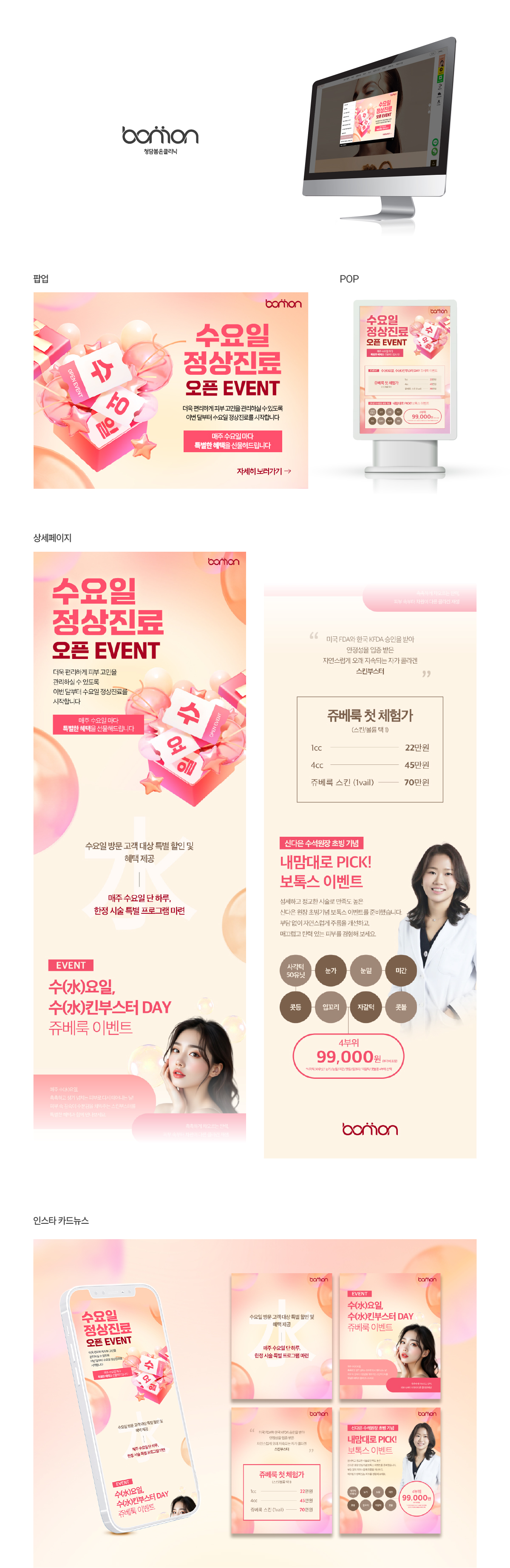 진료 일정 안내 및 오픈 이벤트라는 주제에 맞춰 선물상자, 풍선, 쿠폰 이미지를 활용하여 이벤트적인 분위기를 강조하였습니다. 밝고 경쾌한 인상을 주기 위해 비비드한 핑크 컬러를 사용하였으며, 누구든지 쉽고 편안하게 이벤트에 참여할 수 있도록 유도하는 구성으로 제작하였습니다.