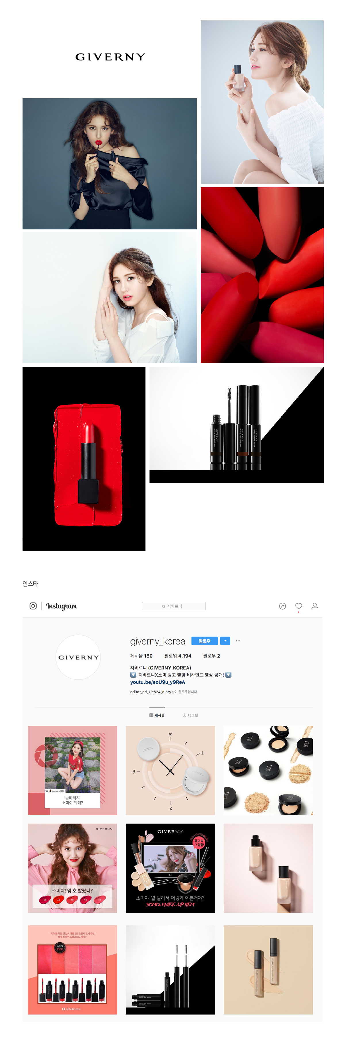 지베르니의 립스틱·파운데이션·마스카라 등 핵심 메이크업 제품을 중심으로 진행된 SNS 채널 비주얼 브랜딩 작업입니다. 인스타그램 콘텐츠는 컬러·텍스처를 중심으로 톤 앤 무드 중심의 콘텐츠 기획 및 디자인 운영이 병행되었습니다. ✔ 콘텐츠 & 제품 감성 컷 혼합 스타일링 ✔ 립/베이스/마스카라 제품군의 질감 & 컬러 강조 ✔ 인스타그램 콘텐츠 톤 통일 및 팔레트 기반 콘텐츠 운영